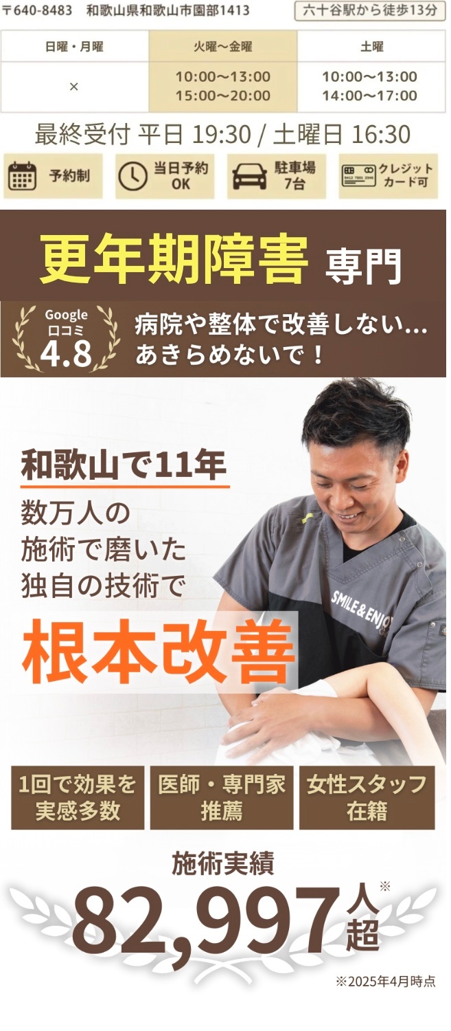 施術中の会話の中で、自律神経のことも気付いて頂きました。体の痛みだけではなく、更年期の症状や自律神経の調子も改善して頂けるのでぜひ一度施術を受けてみて欲しいです。
