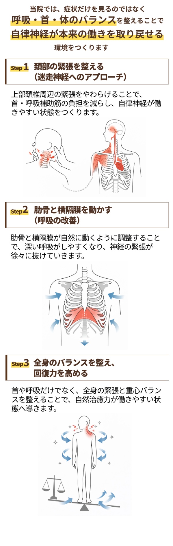 *下記の症状や原因に該当する場合、体の組織が新陳代謝して入れ替わりながら改善していくため、長期間の施術による体質改善が必要になります。