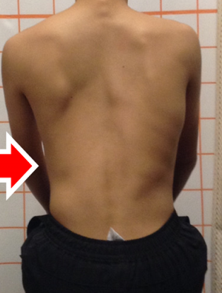 側弯症は背骨が横に曲がってしまっている状態のことで、前屈をすると後ろから見て背中の左右の高さが違います。