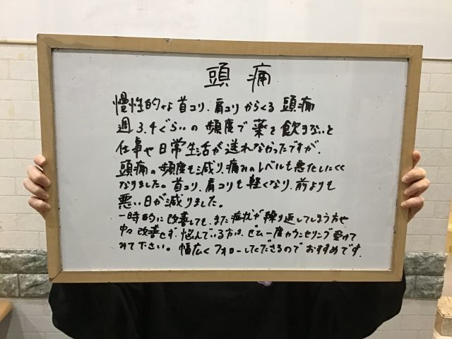 - 頭痛と首・肩こりの改善事例:つらい目の痛みも解消!