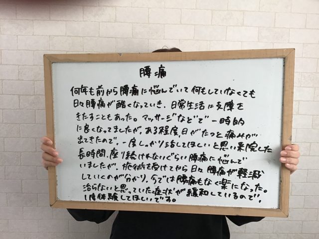 知人の紹介で知り、最初からくわしく説明してくれました。腰痛が激しく、足をあげるのも痛くて困っていました。長く痛みが出ていましたが、通院して痛みが出なくなりました。